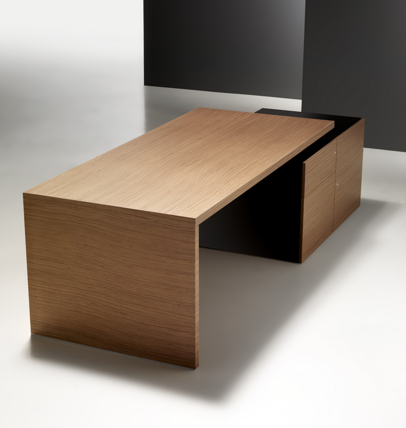 Mesa fabricada en tablero de partículas de 40 mm de espesor, reforzado con elementos metálicos no visibles y recubierto de chapa de madera natural con poro abierto. Con tres acabados disponibles : Ébano, Nogal y Roble.
