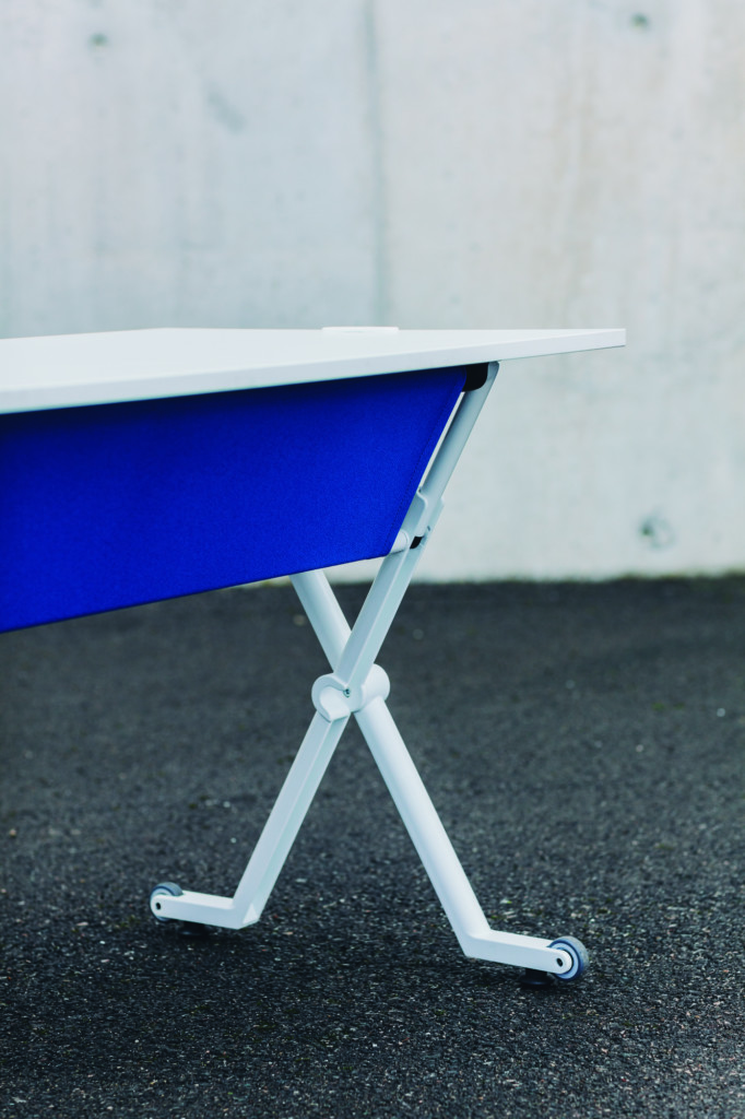 La mesa Folio ha sido diseñada para entornos flexibles y dinámicos, ya que su sistema de plegado y sus ruedas permiten el apilado y almacenaje sin renunciar a la estética.