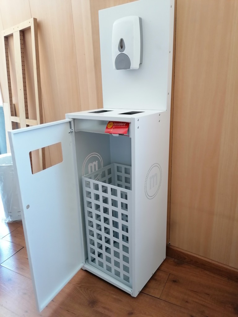 Fabricado en chapa metálica, acabada con pintura epoxi, color a elegir de nuestra carta de acabados. Puerta inferior con cerradura con llave para acceder al interior. Estante interior donde colocar paquete de guantes y mascarillas (no incluidas). Papelera interior (Incluida). Dosificador para gel hidroalcohólico (incluido).