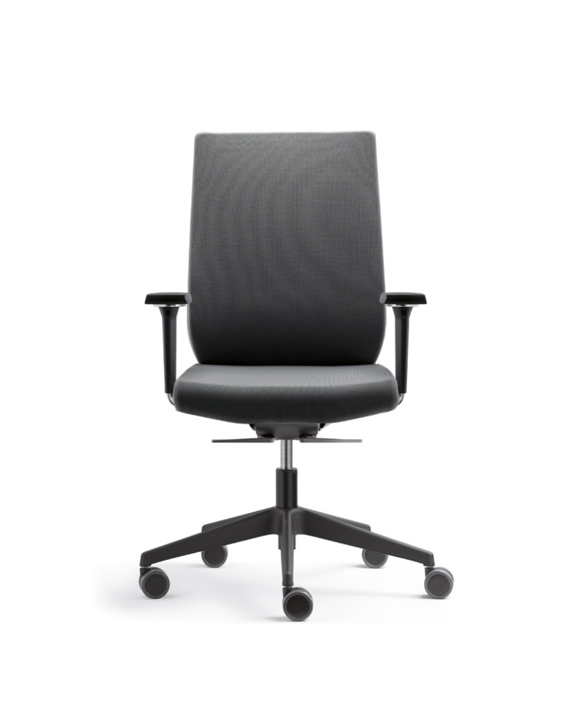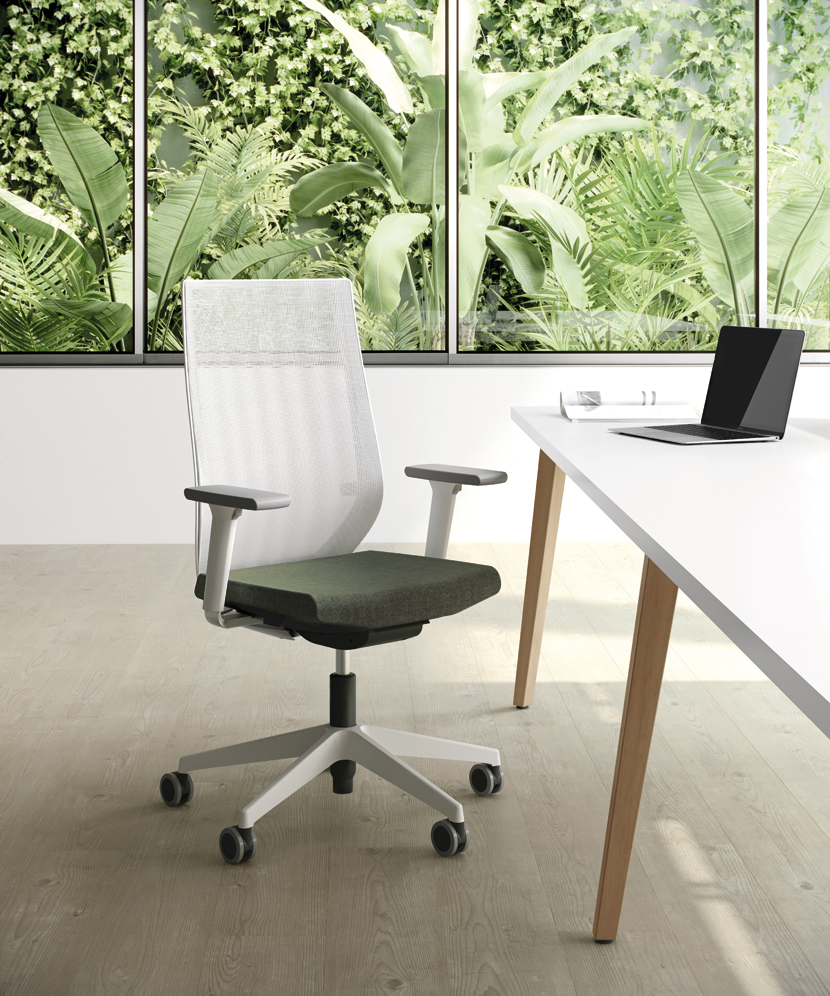 Silla de dirección que hace una perfecta combinación entre lo estético y lo técnico con acabados inspiradores para el trabajo, como son el aluminio y la malla, y unas líneas curvas pronunciadas. Respaldo en malla o respaldo tapizado en poliamida. (negra en caso de respaldo tapizado, a elegir entre blanco polar o negro para respaldo de malla ). Brazo a elegir entre fijo, 1D, 3D y 4D. Base con 3 opciones, poliamida negra, aluminio pulido y aluminio blanco.